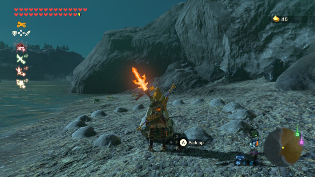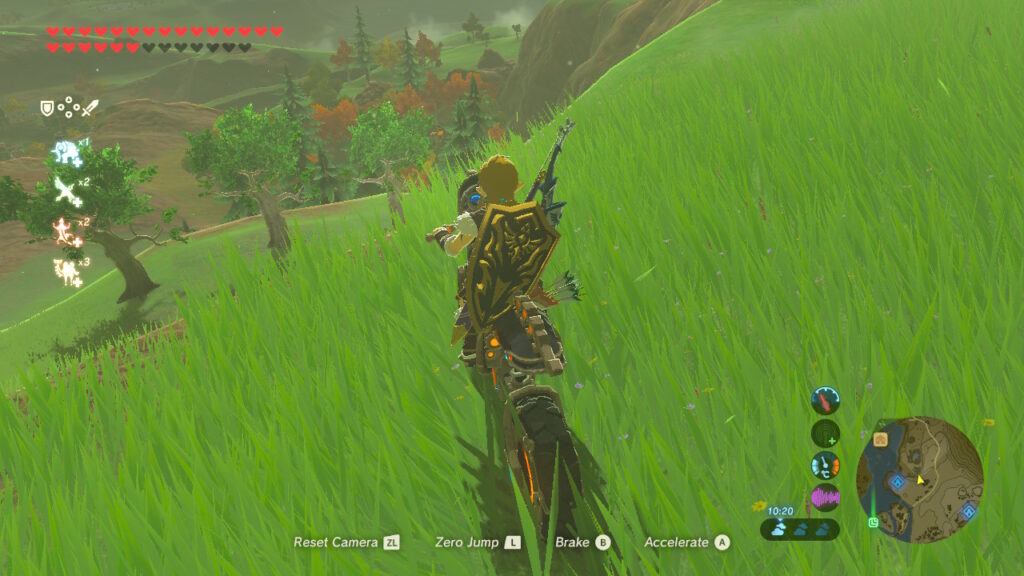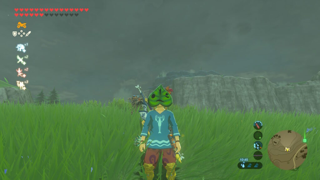 The Korok mask which was released as part of a DLC pack is a great piece of gear that assists in the player’s Korok Hunt. The mask will jingle and shake when in the vicinity of a Korok, and sometimes it’s just vague enough to not be a total crutch. The map is huge, so you still have to go out of your way to seek the seeds out, but now you have a way of ultimately confirming the presence of a seed. There could be an area that you previously visited and found no trace, but upon returning with the mask on it turns out that you juuuuust missed that rock on the ground that was hiding a Korok beneath it. If you run too far away then the mask will stop shaking, indicating that the seed must be in that specific area. This turns every ‘Korok Zone’ into a mini shrine in and of itself, with a reward upon solving whatever the puzzle is offering.