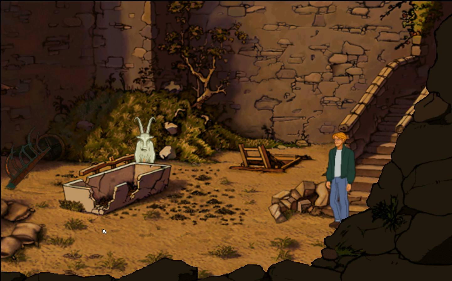 Remember when I said George Stobbart doesn’t run? Well, now he does! If, after clicking on a rusted-out plough that’s nearby, you need to immediately click over to the other side of the screen. Then George will move the plough. The goat will come over and attempt to butt you again. But George, with all the swiftness of a slightly portly toddler, will run across towards the doorway. The goat, in an attempt to follow you, will get the rope on his neck caught on the plough. Thus, trapping him and leaving you free to proceed.