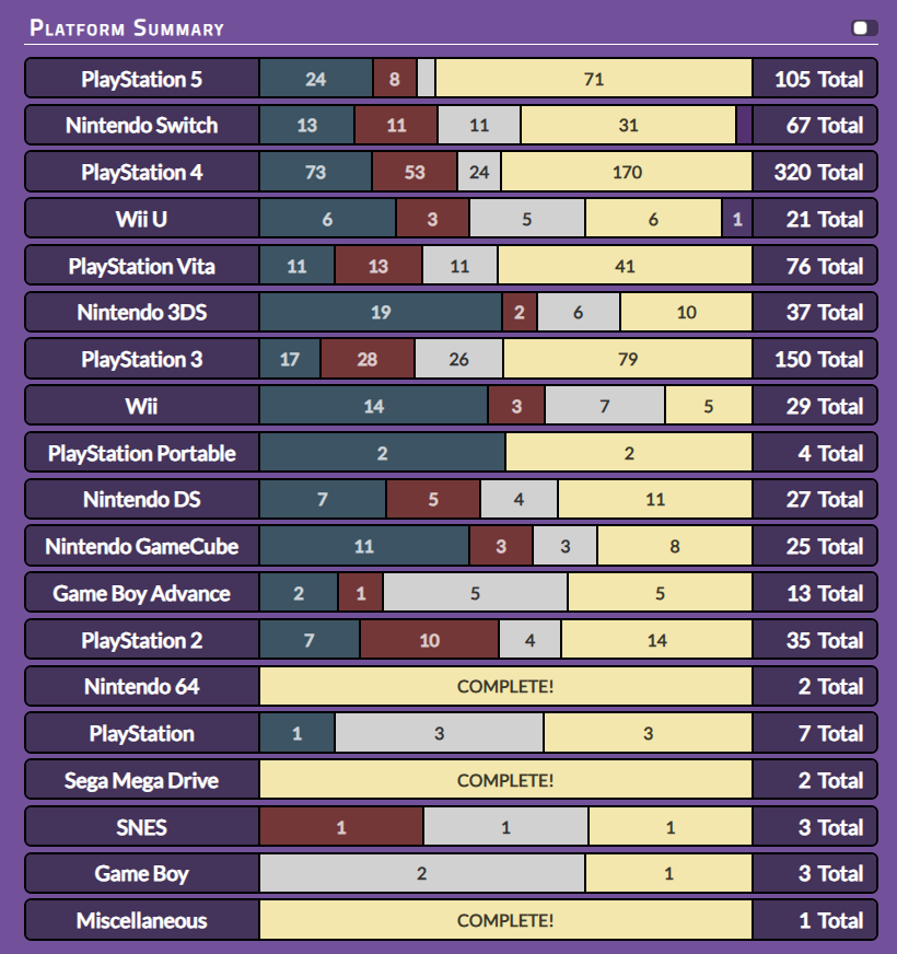 Obviously, backlogs are best tackled in a way that remains non-intrusive to the hobby, i.e. as a way to manage your time more effectively. They aren’t for everyone, but I firmly believe that when it comes to the text-based, statistically-driven logging of a large catalogue of games; Backloggery has a firm and clear advantage over spreadsheets and its competitors, even with its drawbacks. It has an easily searchable interface with clear statuses that can show your current state with your entire backlog at a glance with stats that update dynamically. What more could you ask for?